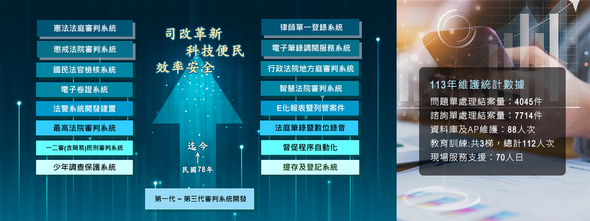 司法審判系統涵蓋司法審判體系相關系統之規劃開發、建置推廣及維護等