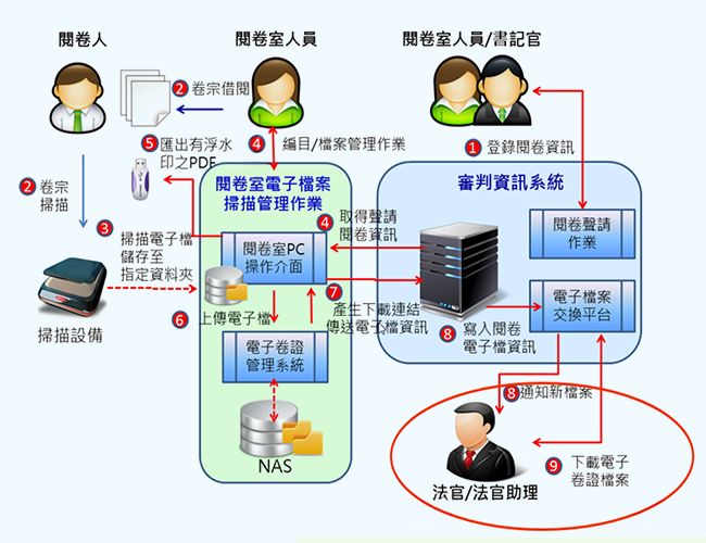 卷證數位化融入科技法庭,結合螢幕、投影設備、實物提示機,即時提示證據,提升庭審效率與透明度。 - 線上聲請閱卷