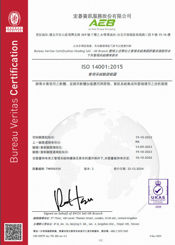 本公司之所有辦公區皆已取ISO14001驗證。透過生命週期(life cycle)思維,重新檢視服務或活動過程中,對環境面之衝擊,最終達到保護環境,提高環境績效,我們每年藉由第三方認證或內部查證機制,以確保系統能維持有效運作。
